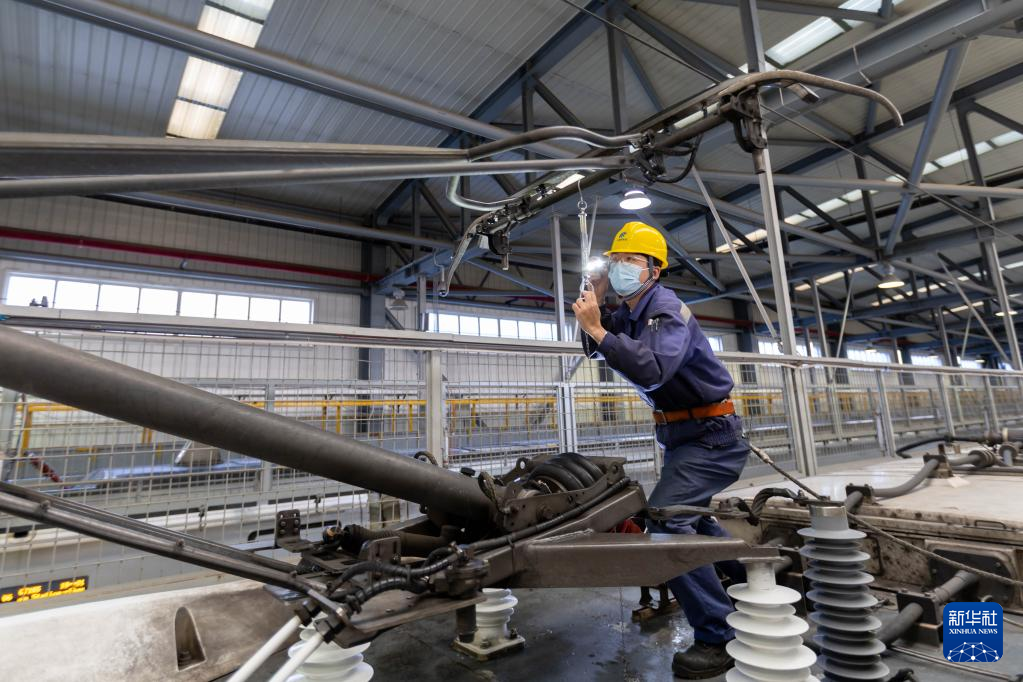 ??1月3日,動車組機械師在上海虹橋動車運用所測量受電弓升弓壓力。