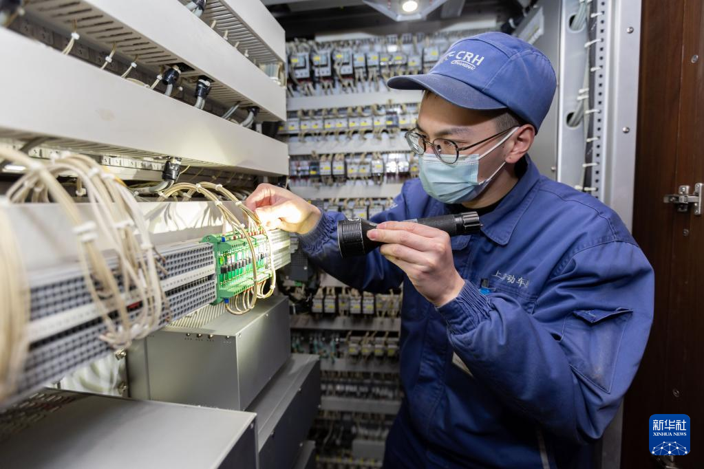 ??1月3日,動車組機械師上海虹橋動車運用所檢查列車電氣柜內(nèi)接線。