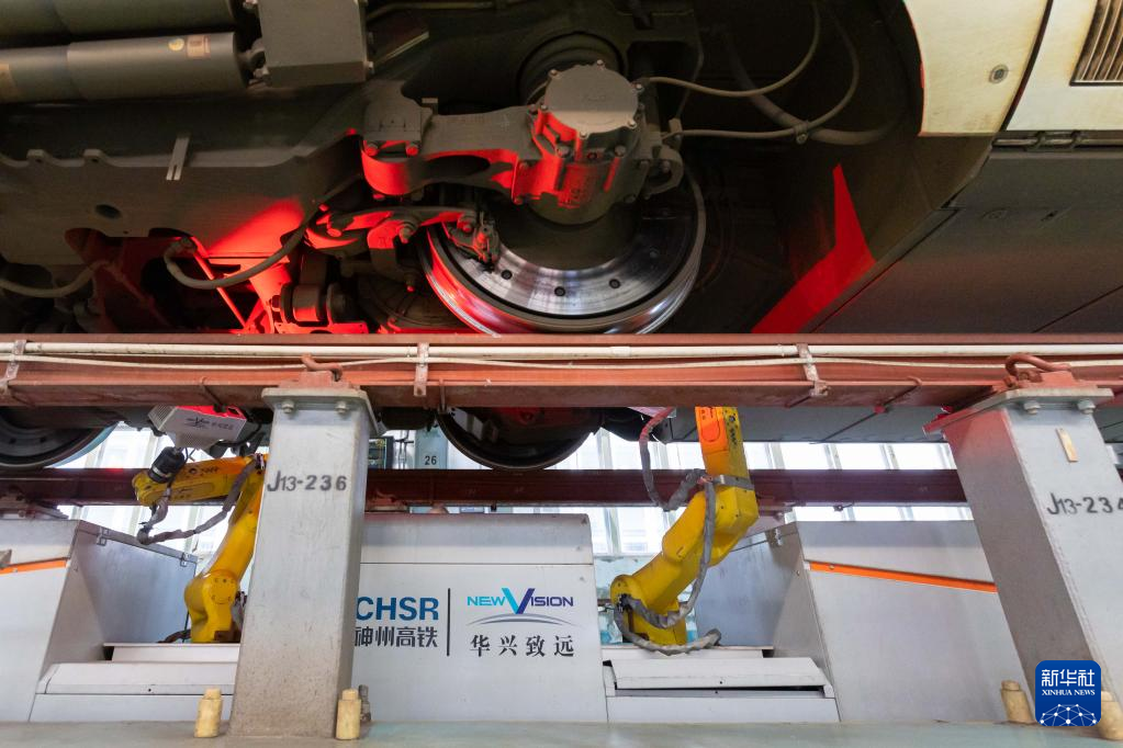 ??1月3日,動車組檢修機器人在上海虹橋動車運用所檢查動車組車底。
