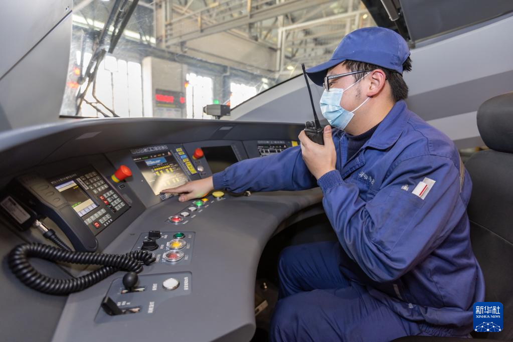 ??1月3日,在上海虹橋動車運用所,動車組機械師與車下作業(yè)人員進行溝通,開展制動試驗。