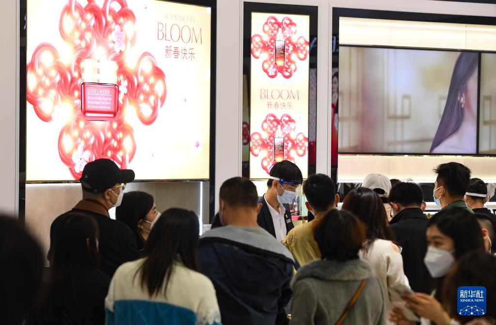 ??1月8日,游客在中免集團(tuán)??谌赵聫V場免稅店排隊結(jié)賬。