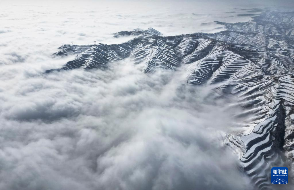 ??2月14日拍攝的甘肅省東鄉(xiāng)族自治縣山區(qū)梯田雪景(無(wú)人機(jī)照片)。