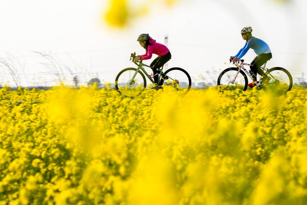 圖為2月21日,騎行愛好者在江西省樟樹市永泰鎮(zhèn)官湖村油菜花海中騎行、賞花。(周亮 攝)