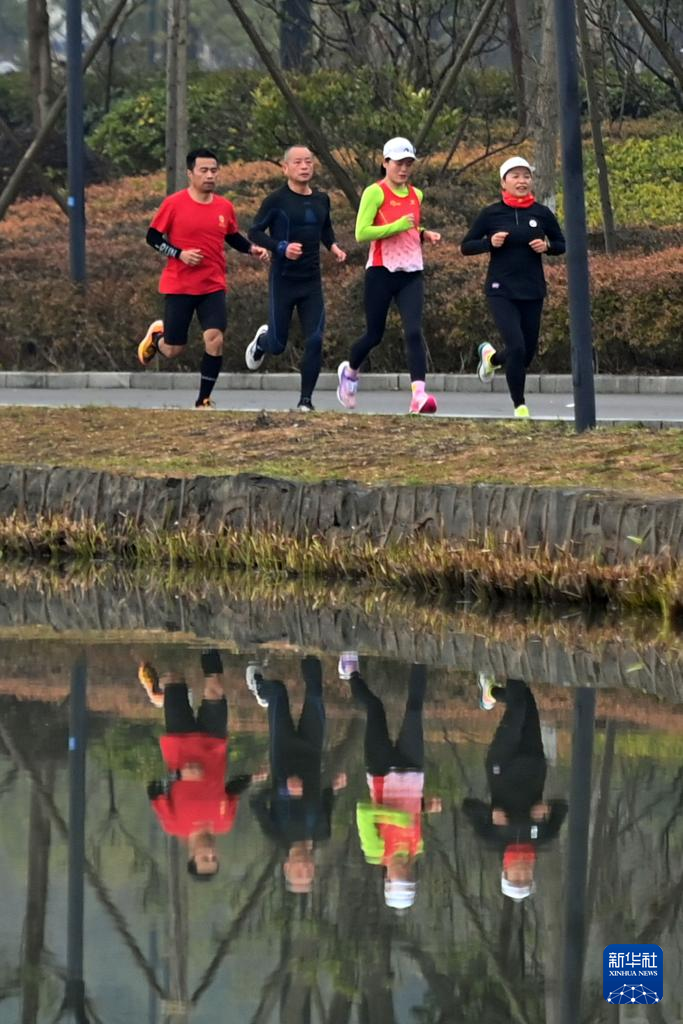 ??3月1日,跑步愛好者在浙江省寧波市奉化區(qū)仁湖公園晨跑。