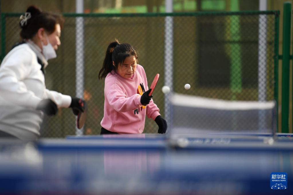 ??3月3日,市民在甘肅省蘭州市體育公園的室外乒乓球場(chǎng)打球。