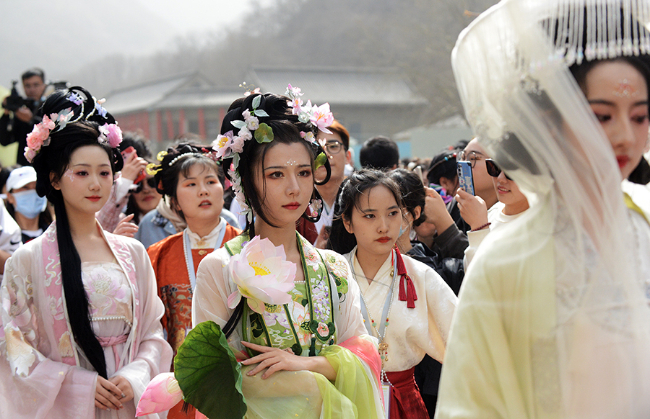 ??據(jù)了解,第五屆云臺(tái)山漢服花朝節(jié)融入藝術(shù)、詩(shī)詞、水墨等元素打造沉浸式國(guó)風(fēng)藝術(shù)空間,吸引眾多游客前來(lái)一睹漢服風(fēng)采。(王克偉攝)
