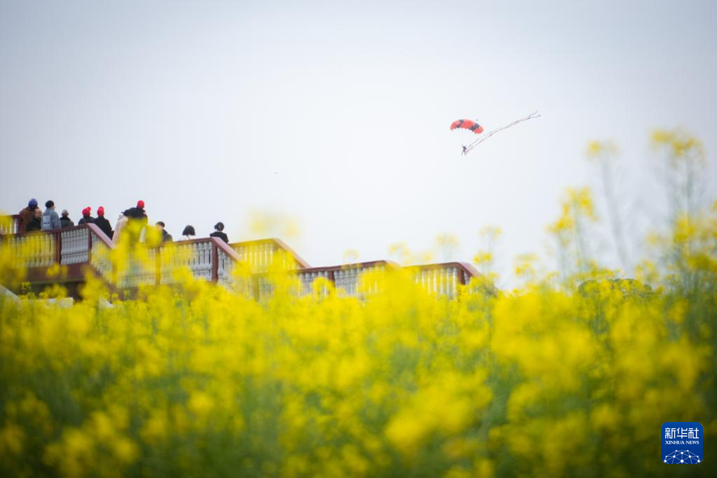 ??3月18日,游客在油菜花節(jié)核心景區(qū)觀看跳傘表演。