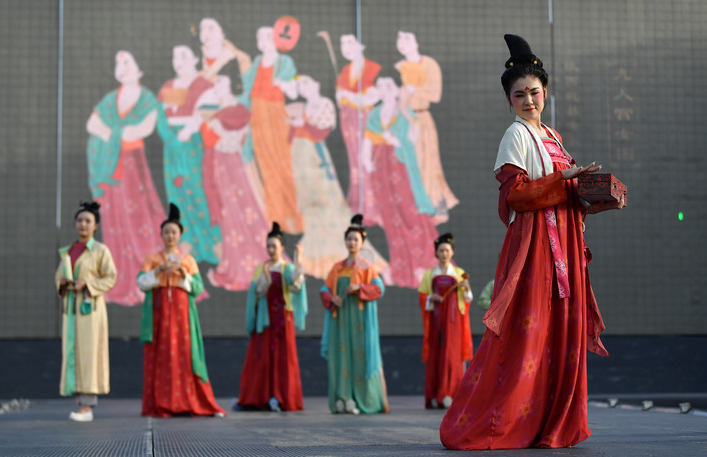 4月25日,西安大唐不夜城步行街舉行華服走秀。新華社發(fā)(鄒競一 攝)