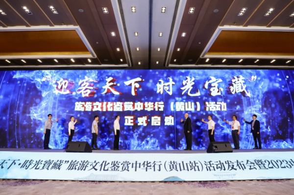 ??大會(huì)最后,八位嘉賓共同上臺(tái)按下啟動(dòng)按鈕,宣布“迎客天下 時(shí)光寶藏——旅游文化鑒賞中華行(黃山)活動(dòng)”正式啟動(dòng)。