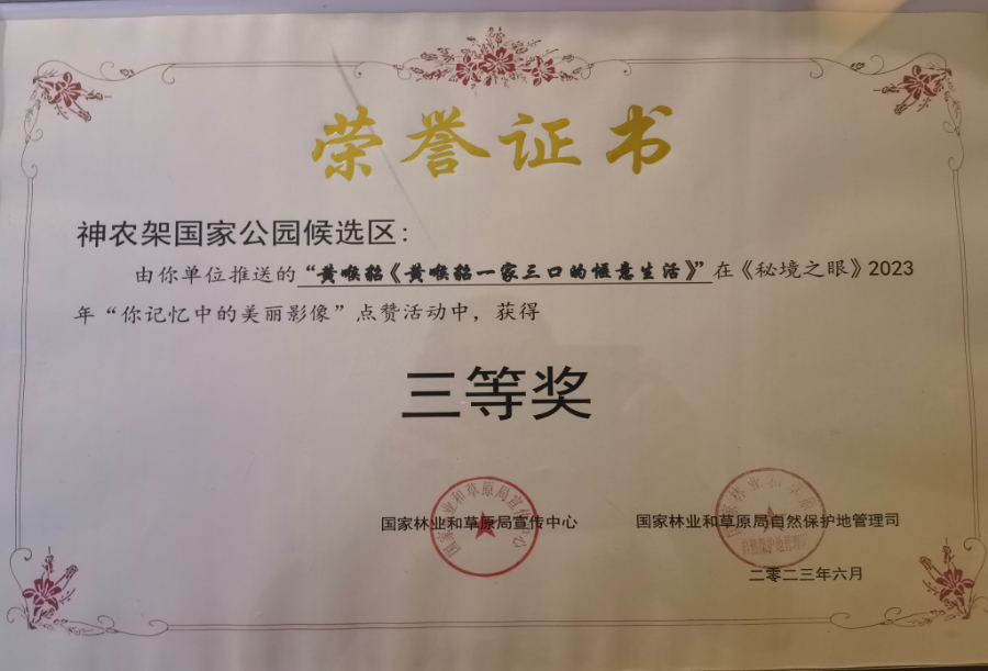 ??論壇期間,由國家林業(yè)和草原局(國家公園管理局)、貴州省人民政府共同主辦的“呵護(hù)自然之美·促進(jìn)綠色發(fā)展---高質(zhì)量推進(jìn)自然保護(hù)地體系建設(shè)”主題論壇上,國家林業(yè)和草原局與世界自然保護(hù)聯(lián)盟(IUCN)中國代表處為神農(nóng)架國家公園候選區(qū)、內(nèi)蒙古大興安嶺汗馬國家級(jí)自然保護(hù)區(qū)等13家 《IUCN綠色名錄》中國自然保護(hù)地管理機(jī)構(gòu)授牌 “世界最佳自然保護(hù)地”;同時(shí),國家林業(yè)和草原局公布《秘境之眼》年度優(yōu)秀視頻獲獎(jiǎng)名單,神農(nóng)架國家公園候選區(qū)推送的《黃喉貂一家三口的愜意生活》在《秘境之眼》2023年度“你記憶中的美麗影像”點(diǎn)贊活動(dòng)中獲“三等獎(jiǎng)”。