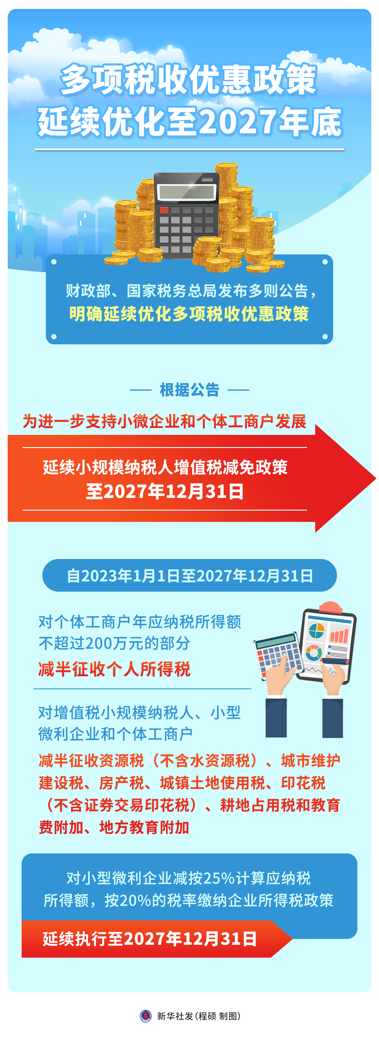 根據(jù)公告,為進(jìn)一步支持小微企業(yè)和個(gè)體工商戶發(fā)展,延續(xù)小規(guī)模納稅人增值稅減免政策至2027年12月31日。自2023年1月1日至2027年12月31日,對個(gè)體工商戶年應(yīng)納稅所得額不超過200萬元的部分,減半征收個(gè)人所得稅;對增值稅小規(guī)模納稅人、小型微利企業(yè)和個(gè)體工商戶減半征收資源稅(不含水資源稅)、城市維護(hù)建設(shè)稅、房產(chǎn)稅、城鎮(zhèn)土地使用稅、印花稅(不含證券交易印花稅)、耕地占用稅和教育費(fèi)附加、地方教育附加。對小型微利企業(yè)減按25%計(jì)算應(yīng)納稅所得額,按20%的稅率繳納企業(yè)所得稅政策,延續(xù)執(zhí)行至2027年12月31日。
