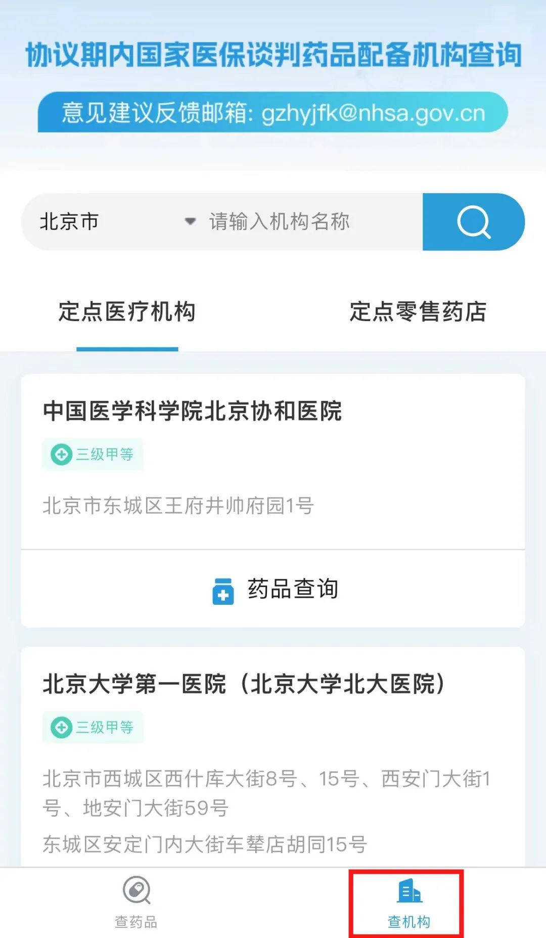 第三步:點(diǎn)擊“定點(diǎn)醫(yī)療機(jī)構(gòu)”或“定點(diǎn)零售藥店”,即可查詢?cè)撍幤吩诟鞯貐^(qū)的配備情況。