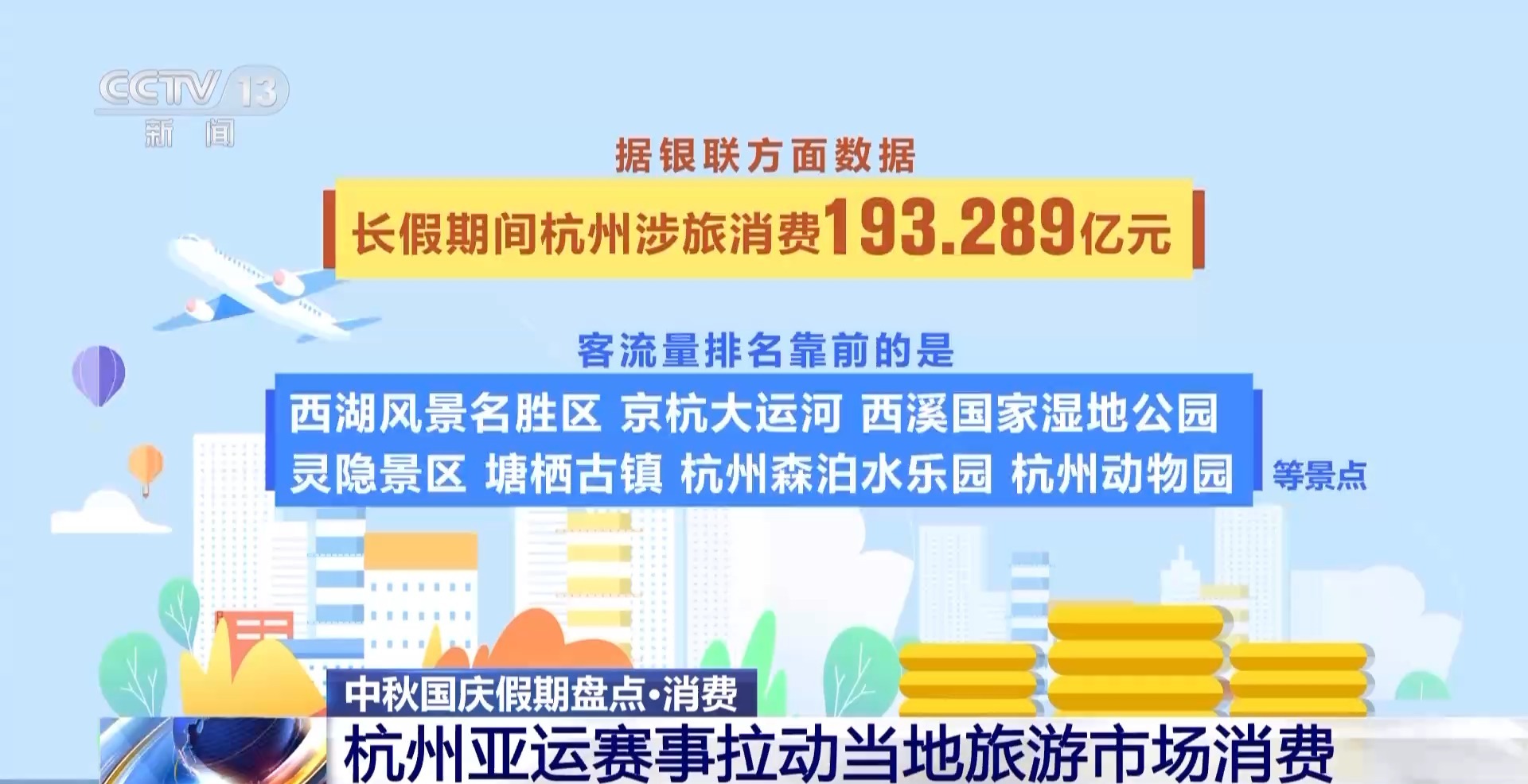 另據(jù)銀聯(lián)方面數(shù)據(jù),長假期間杭州涉旅消費193.289億元??土髁颗琶壳暗氖俏骱L景名勝區(qū)、京杭大運河、西溪國家濕地公園、靈隱景區(qū)、塘棲古鎮(zhèn)、杭州森泊水樂園、杭州動物園等景點。