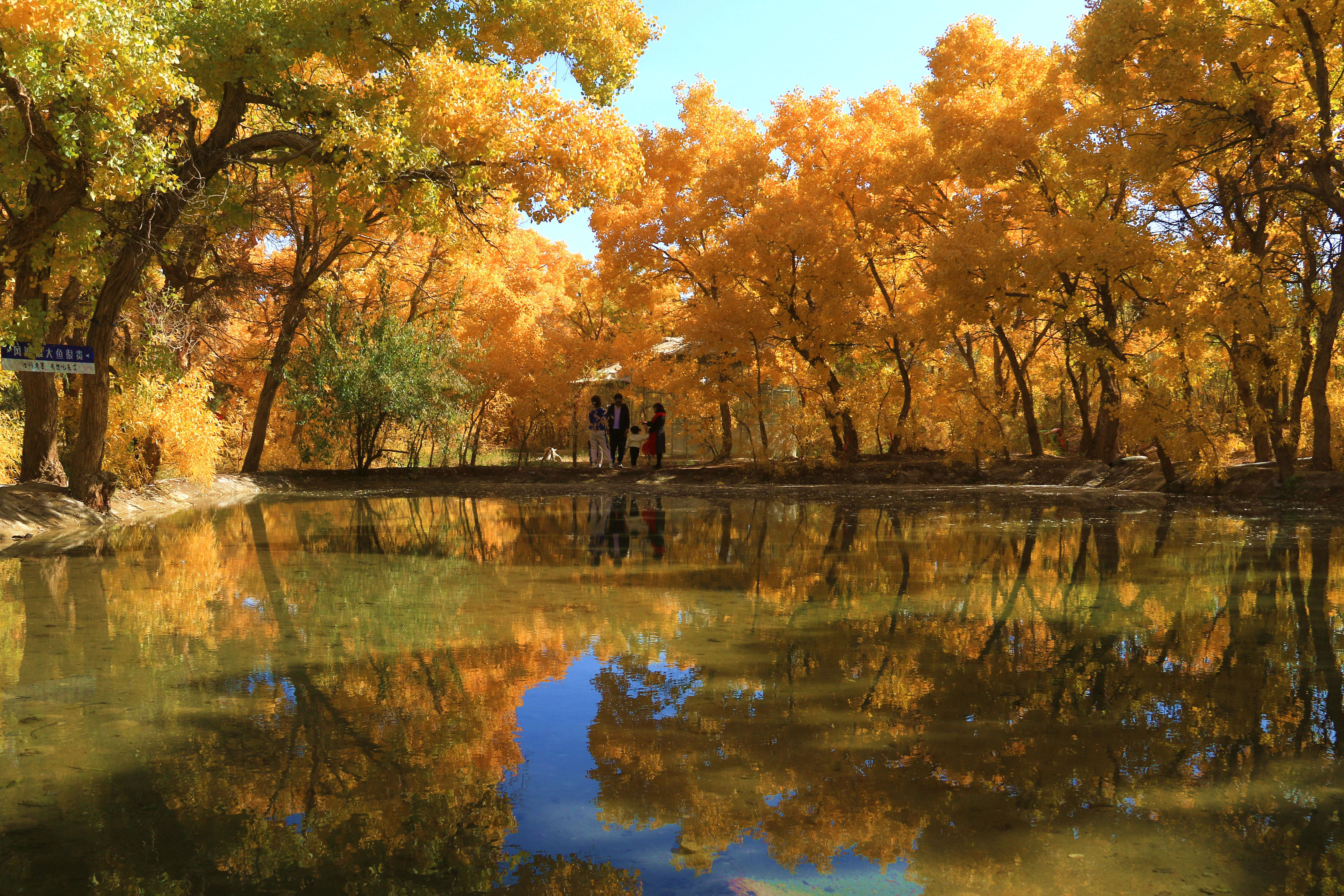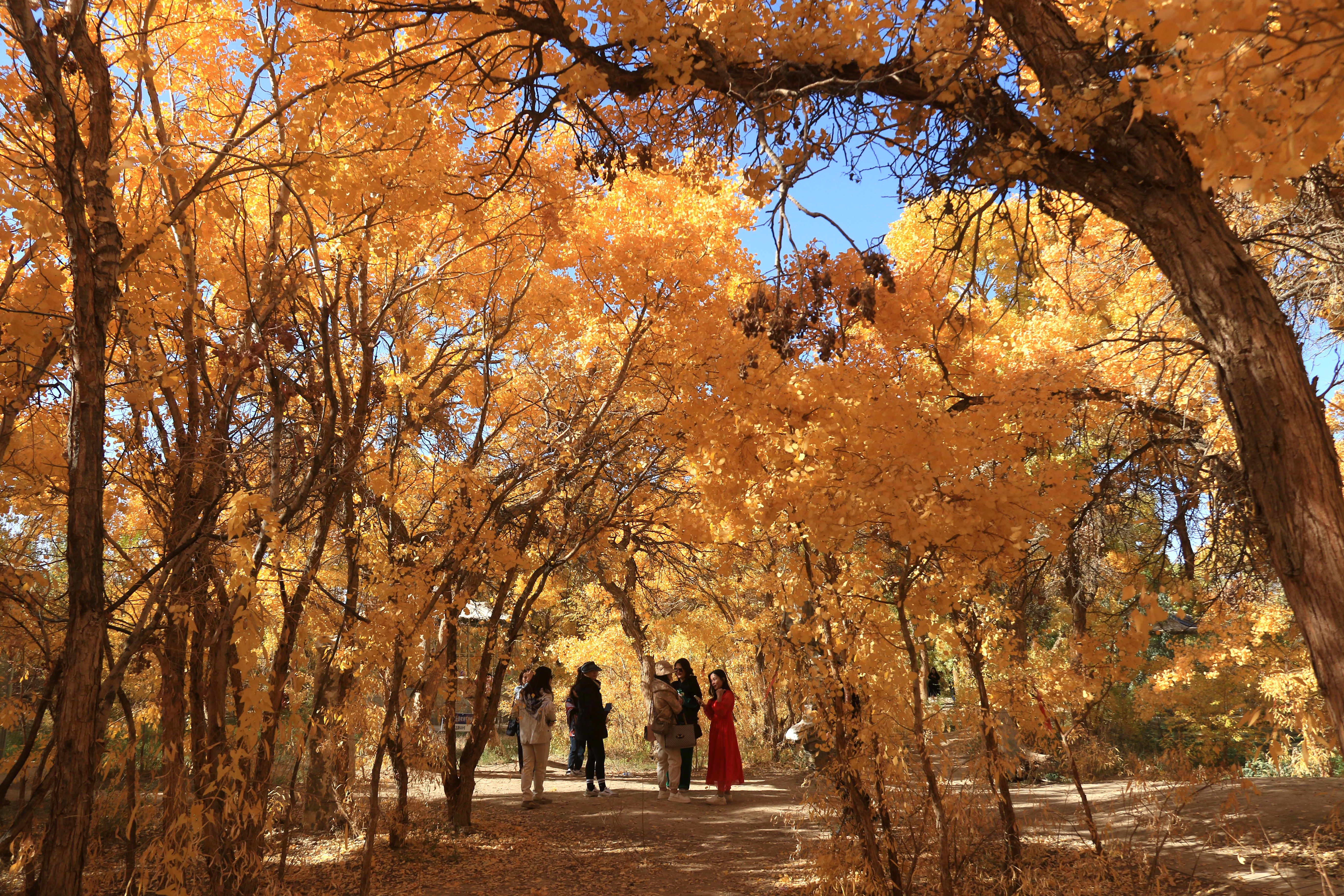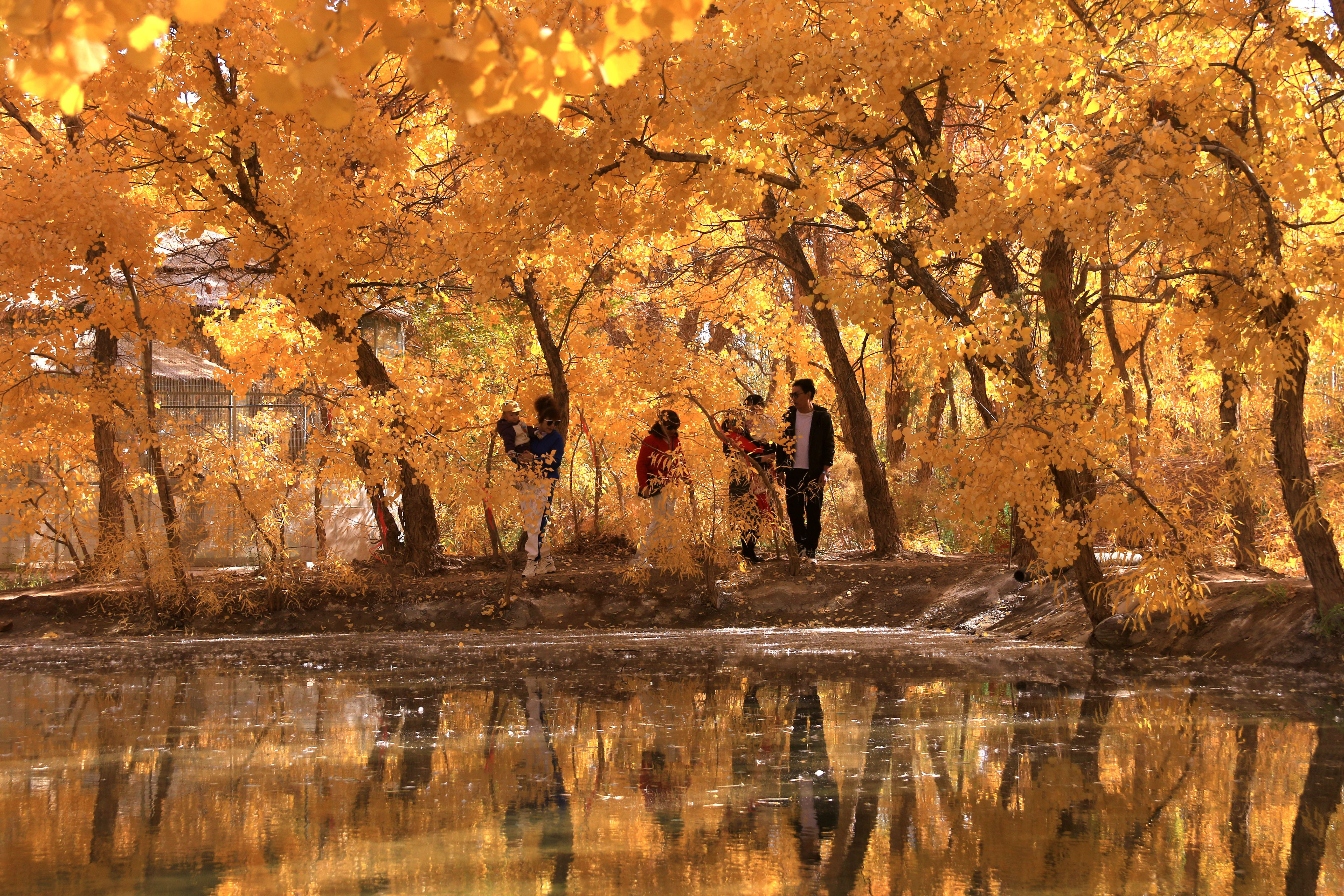10月17日,游客在甘肅省敦煌市莫高鎮(zhèn)的胡楊林中賞景。