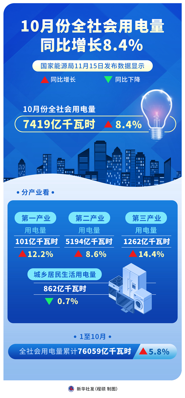 新華社北京11月15日電(記者戴小河)國(guó)家能源局15日發(fā)布數(shù)據(jù)顯示,10月份全社會(huì)用電量7419億千瓦時(shí),同比增長(zhǎng)8.4%。