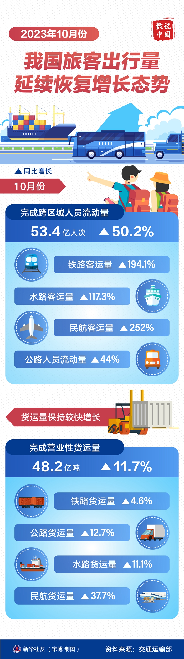 在當日舉行的交通運輸部例行新聞發(fā)布會上,交通運輸部新聞發(fā)言人孫文劍說,10月份,完成跨區(qū)域人員流動量53.4億人次,同比增長50.2%。鐵路客運量同比增長194.1%,水路客運量同比增長117.3%,民航客運量同比增長252%,公路人員流動量同比增長44%。