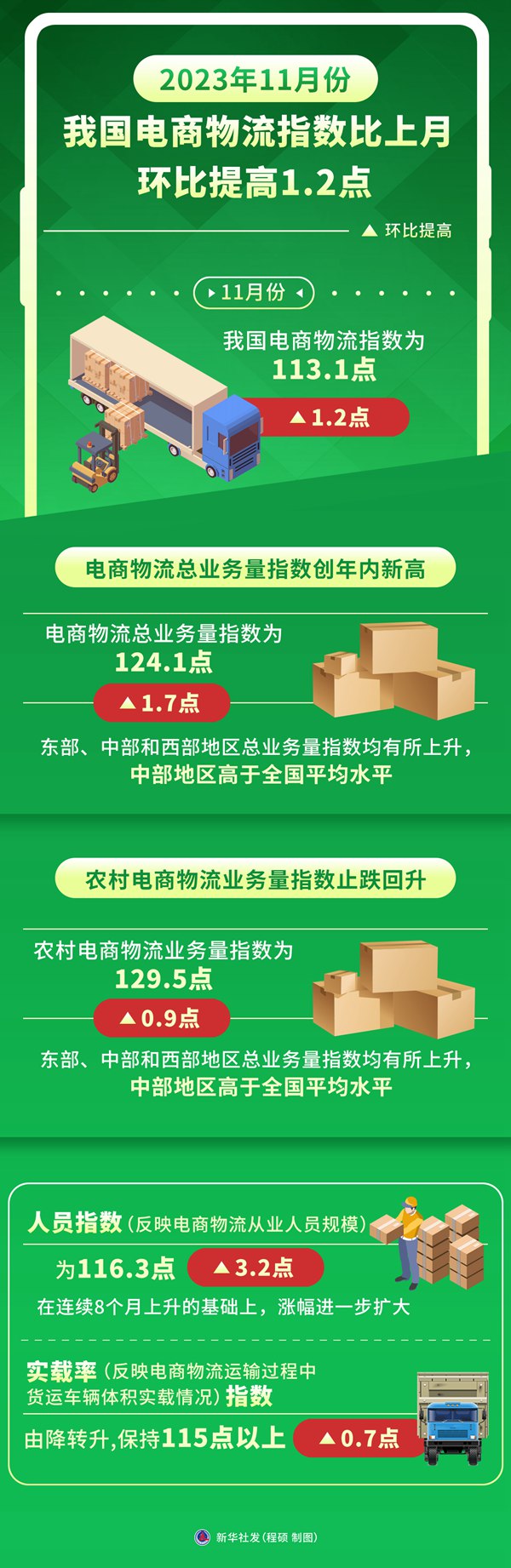 電商物流總業(yè)務(wù)量指數(shù)創(chuàng)年內(nèi)新高。11月份,電商物流總業(yè)務(wù)量指數(shù)為124.1點(diǎn),比上月提高1.7點(diǎn)。東部、中部和西部地區(qū)總業(yè)務(wù)量指數(shù)均有所上升,中部地區(qū)高于全國(guó)平均水平。
