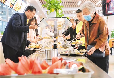 | 10月13日,吉林省長春新區(qū)飛躍街道三佳社區(qū)敬老餐廳內(nèi),老人正在選取午餐。 |