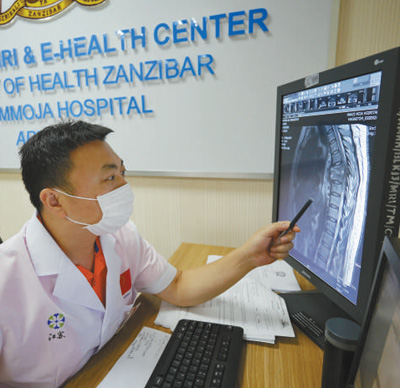 從第一臺X光機、CT設備,再到目前整個桑給巴爾地區(qū)唯一一臺核磁共振機,納茲莫加醫(yī)院影像科的設備物資都來自中國捐贈。不久前,影像科還增添了遠程視頻設備。通過遠程技術,中國醫(yī)療隊可以對接中國國內優(yōu)質醫(yī)療資源,對當地復雜病例進行在線會診。桑給巴爾地區(qū)現(xiàn)有的5名影像科醫(yī)生,就是在一批批中國醫(yī)療隊隊員的帶教下成長起來的。