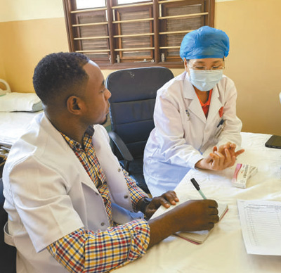 | 醫(yī)療隊在奔巴島開展義診,圖為婦產科醫(yī)生史曉瑩(右)同當地醫(yī)生交流患者情況。 |