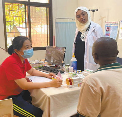 | 醫(yī)療隊在桑給巴爾島開展義診,圖為內科醫(yī)生劉翠霞(左一)接診患者。 |