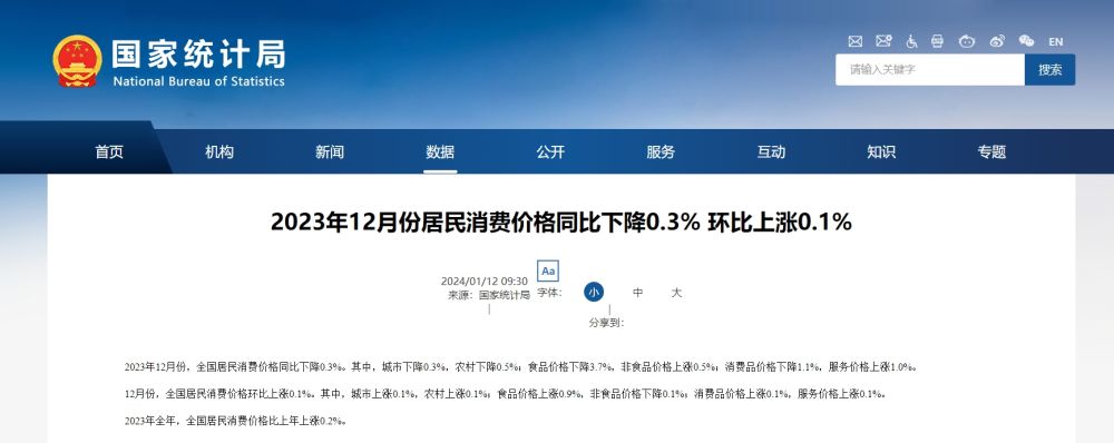 ??2023年12月份,全國居民消費(fèi)價格同比下降0.3%。其中,城市下降0.3%,農(nóng)村下降0.5%;食品價格下降3.7%,非食品價格上漲0.5%;消費(fèi)品價格下降1.1%,服務(wù)價格上漲1.0%。