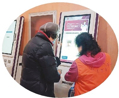 | 在北京清華長(zhǎng)庚醫(yī)院,志愿者在引導(dǎo)老年患者使用自助機(jī)。 |