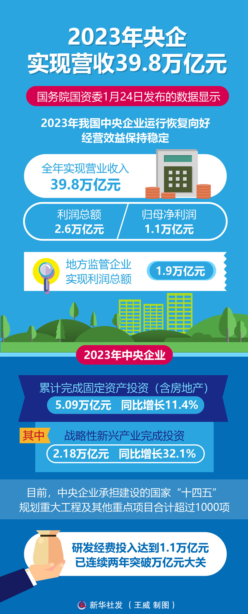 2023年,中央企業(yè)有效投資大幅增長(zhǎng),累計(jì)完成固定資產(chǎn)投資(含房地產(chǎn))5.09萬億元、同比增長(zhǎng)11.4%,其中戰(zhàn)略性新興產(chǎn)業(yè)完成投資2.18萬億元、同比增長(zhǎng)32.1%。目前,中央企業(yè)承擔(dān)建設(shè)的國(guó)家“十四五”規(guī)劃重大工程及其他重點(diǎn)項(xiàng)目合計(jì)超過1000項(xiàng)。