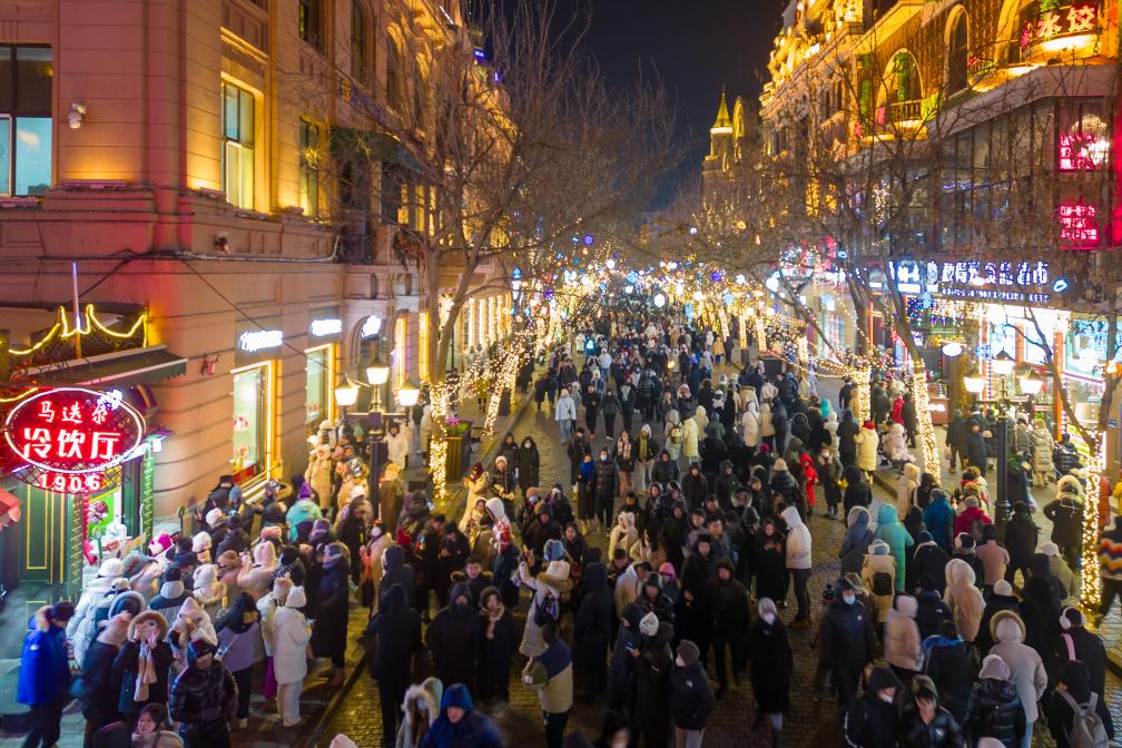 2024年1月9日,游客在哈爾濱百年老街中央大街上游玩(無人機照片)。新華社記者張濤攝