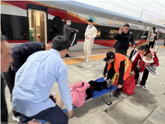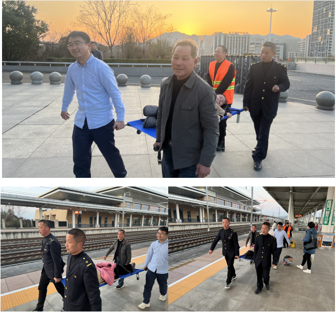“怎么了這是?需要搭把手嗎?”2024年2月14日,客運(yùn)值班員周就沁巡視站區(qū)時(shí),看到一行旅客大大小小六七人在落客平臺(tái)面露難色,便上前詢問(wèn)是否需要幫助,打聽(tīng)一番了解到,該行旅客系一家六口來(lái)玉山探親,其中張女士在探親期間不慎尾椎骨骨折,致使無(wú)法正常行走、坐臥,來(lái)站路上都勉強(qiáng)堅(jiān)持,現(xiàn)準(zhǔn)備進(jìn)站,但攜帶行李較多還有兩位小朋友,正在犯難怎么順利進(jìn)站上車。“沒(méi)事沒(méi)事,辦法總比困難多,咱有擔(dān)架,可以躺著舒服地進(jìn)站上車。”周就沁笑意盈盈地說(shuō)道,說(shuō)著便電臺(tái)呼叫客運(yùn)員吳國(guó)林、潘建富攜帶擔(dān)架趕往落客平臺(tái),協(xié)助張女士進(jìn)站。“長(zhǎng)這么大還沒(méi)有體驗(yàn)過(guò)這種待遇,原來(lái)只知道鐵路有輪椅服務(wù),沒(méi)想到還有擔(dān)架,現(xiàn)在鐵路服務(wù)是越來(lái)越好了,想的真周到!”