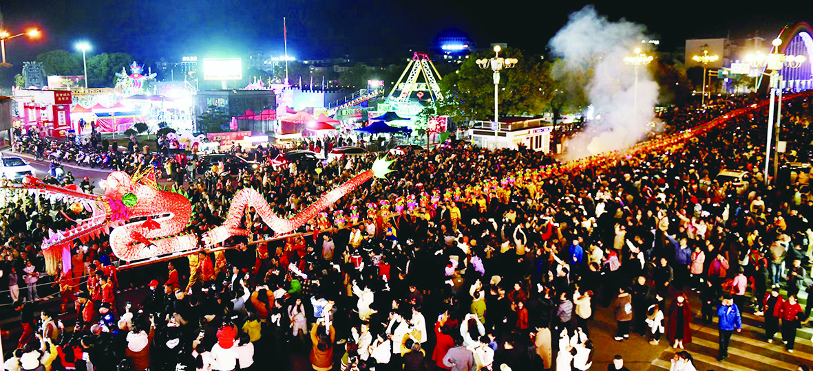 2月14日,德興市銀城街道辦天門山居委會(huì)自發(fā)組織了舞長龍鬧新春活動(dòng)。當(dāng)?shù)乩习傩兆灾苹粞b在特制的板凳上后,集中連接一起組成全長近400米的板凳長龍,走街串巷舞動(dòng)長龍鬧新春,吸引了數(shù)萬群眾前來觀看。