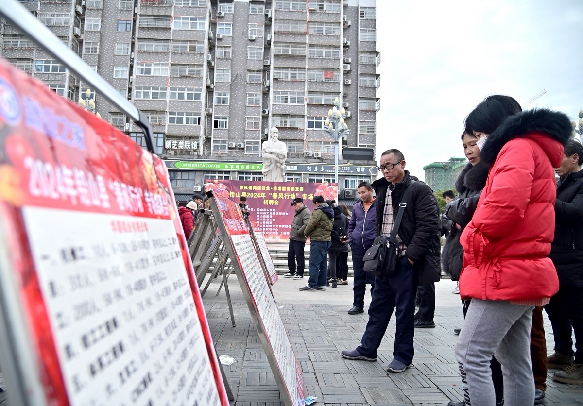 2月16日,在鉛山縣河口鎮(zhèn)辛棄疾廣場(chǎng),求職者正在尋找適合的崗位。當(dāng)日,鉛山縣2024年“春風(fēng)行動(dòng)”系列招聘會(huì)正式啟動(dòng),當(dāng)天共有49家重點(diǎn)企業(yè)現(xiàn)場(chǎng)招聘,累計(jì)提供就業(yè)崗位2000余個(gè)。