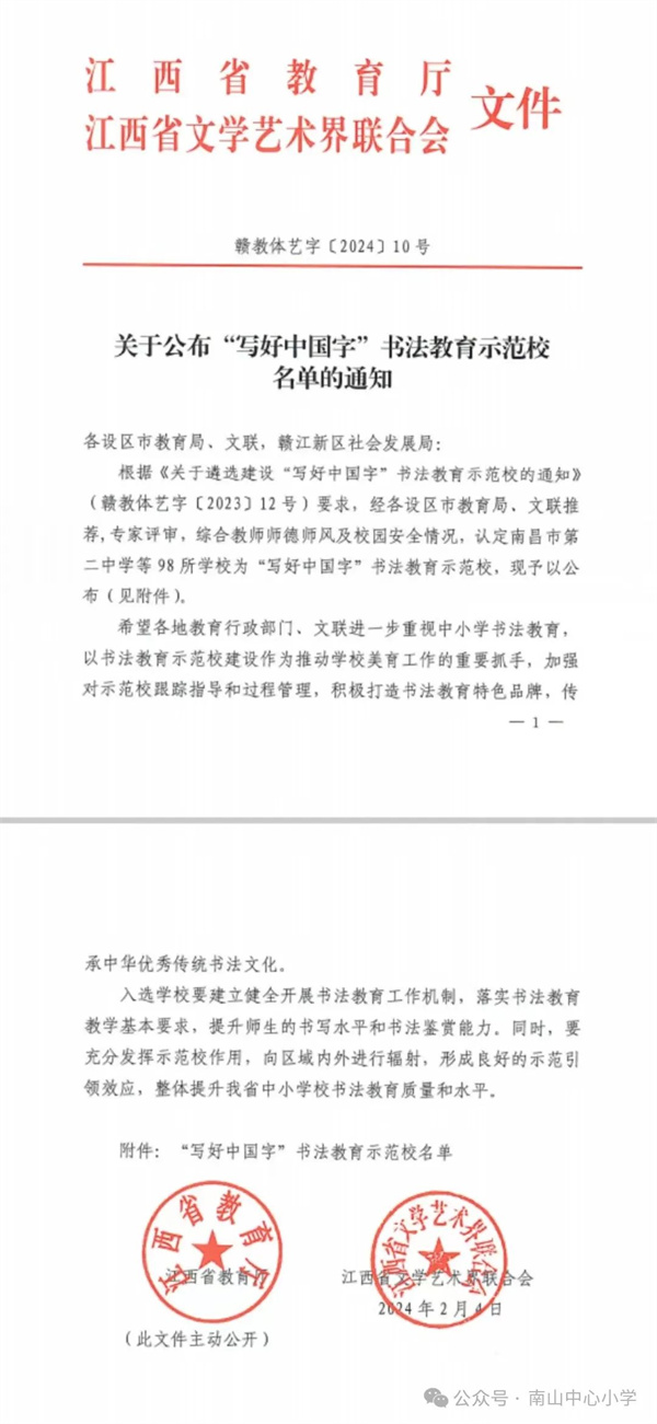 近日,在江西省教育廳和省文學(xué)藝術(shù)界聯(lián)合會舉辦的“遴選建設(shè)‘寫好中國字’書法教育示范校”評選活動中,認定南昌市第二中學(xué)等98所學(xué)校為“寫好中國字”書法教育示范校,其中,玉山縣南山中心小學(xué)成功當(dāng)選。