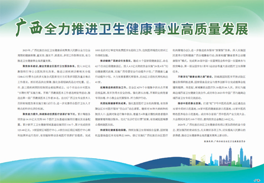 2023年,廣西壯族自治區(qū)衛(wèi)生健康系統(tǒng)聚焦人民群眾全方位全周期的健康保障,重實效、強實干、抓落實,多項工作取得實效,有力推進衛(wèi)生健康事業(yè)高質(zhì)量發(fā)展。