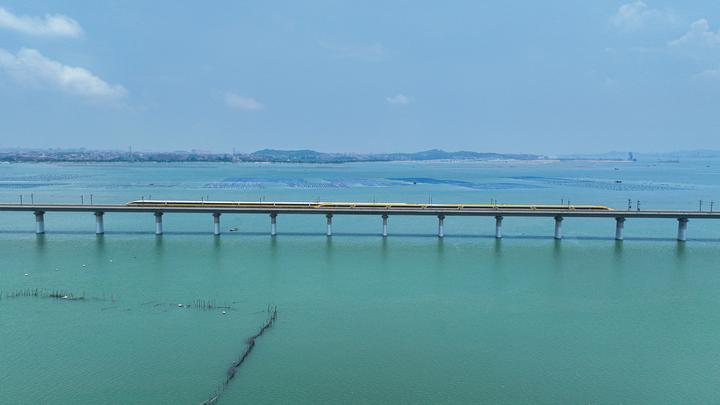 2023年6月28日,CR450動(dòng)車組試驗(yàn)列車在湄洲灣跨海大橋交會(huì)運(yùn)行,單列最高運(yùn)行時(shí)速達(dá)到453公里。(鐵科院集團(tuán)公司供圖)