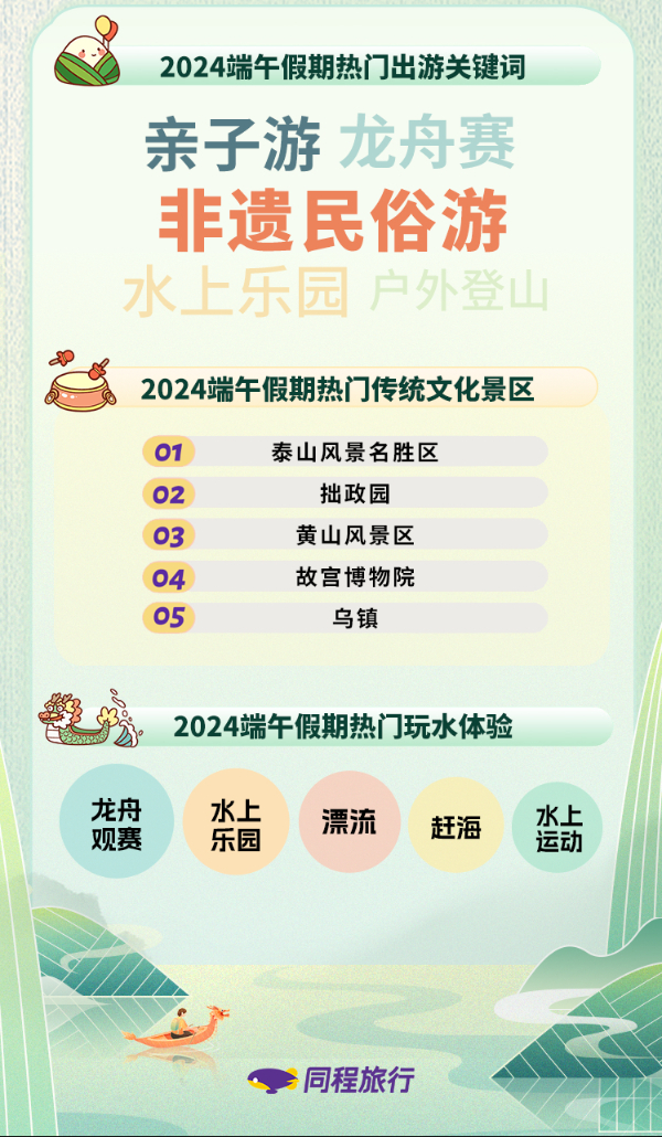 據(jù)了解,廣東、湖南、浙江、貴州、云南等地舉辦龍舟競渡。湖北武漢推出“漫游武漢”系列文化和旅游活動。河南通過非遺展演、端午習俗等沉浸式場景讓游客感受傳統(tǒng)文化魅力。安徽推出花戲樓里的情景劇、沉浸式微空間體驗劇等產(chǎn)品。江蘇舉辦“水韻江蘇·樂購非遺”活動。各地還將傳統(tǒng)民俗、民間藝術(shù)有機融入博物館、美術(shù)館、圖書館、戲劇場、電影院等文化空間,豐富了文旅深入融合的新場景。根據(jù)同程旅行數(shù)據(jù)顯示,非遺民俗游、親子游、龍舟觀賽、水上樂園和戶外登山是端午假期最熱門的出游主題。