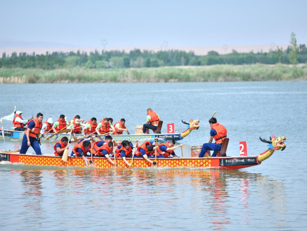6月9日,龍舟隊伍在寧夏中衛(wèi)市金沙島舉辦的龍舟爭霸賽上競渡。新華社發(fā)
