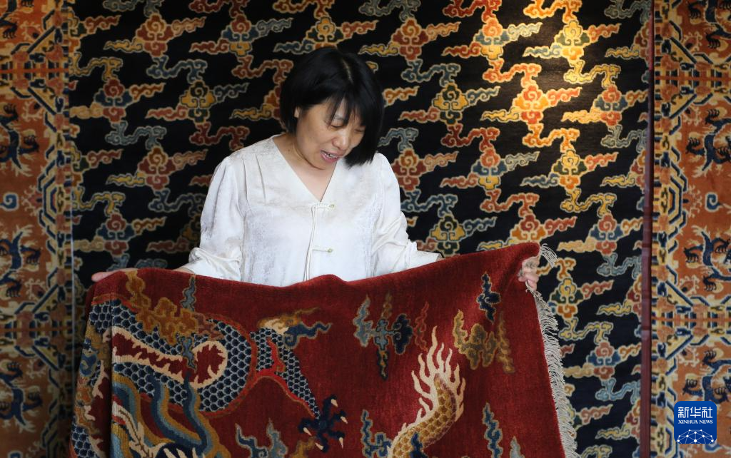 6月27日,在位于北京十里河的工作室,冀豫展示其團(tuán)隊(duì)的宮毯作品。