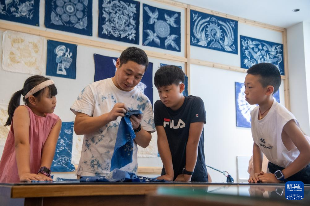 7月10日,在重慶市秀山縣的非遺文創(chuàng)街蠟染館內(nèi),蠟染傳承人劉春林(左二)在向青少年傳授染色技巧。