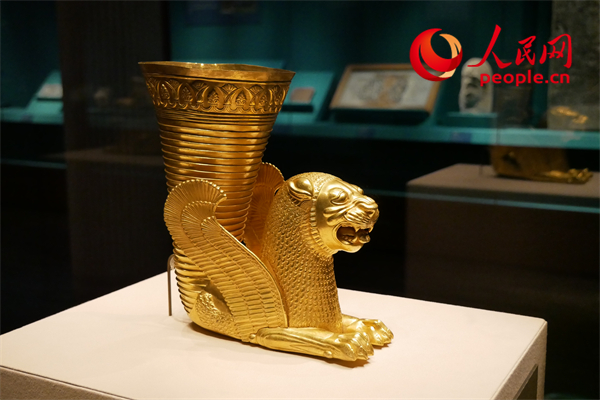 “璀璨波斯——伊朗文物精華展”展出的金翼獅來(lái)通。人民網(wǎng)記者 韋衍行攝