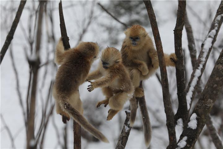 冬日在林間嬉戲的神農(nóng)架金絲猴(神農(nóng)架國家公園管理局供圖)