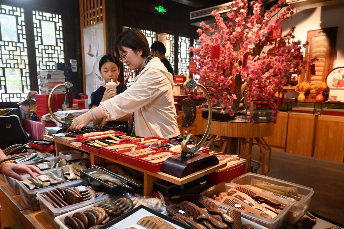 來(lái)自南京的旅客正和女兒一起挑選國(guó)家級(jí)非物質(zhì)文化遺產(chǎn)常州梳篦。人民網(wǎng) 謝地?cái)z
