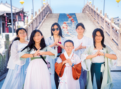 營員身穿漢服,在南通栟茶古鎮(zhèn)參觀。