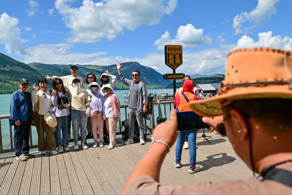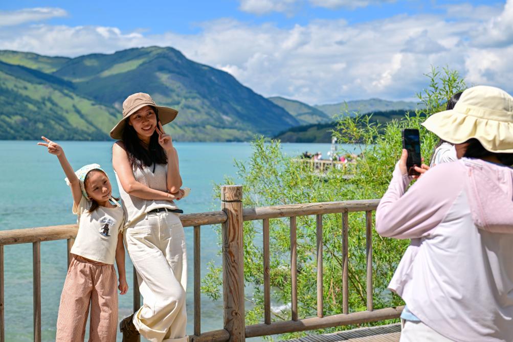 游客在新疆阿勒泰地區(qū)喀納斯景區(qū)觀光游覽。新華社記者 丁磊 攝
