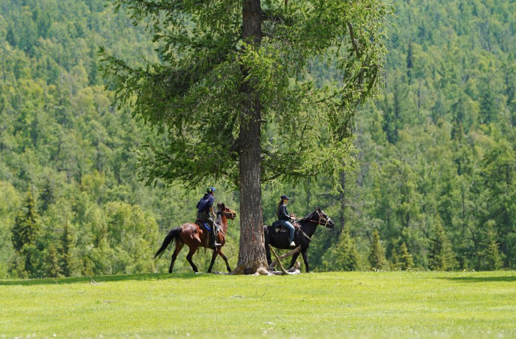 在新疆阿勒泰地區(qū)哈巴河縣,游客在騎馬。新華社記者 阿曼 攝
