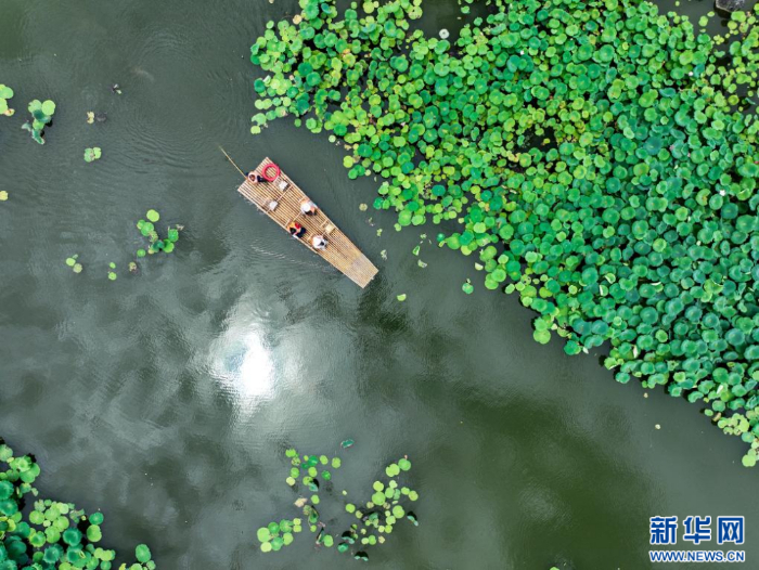 游客在安徽省黃山市徽州區(qū)呈坎古村乘竹筏游覽(無人機(jī)照片)。