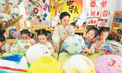 在江蘇省連云港市東海縣幼兒園濱河分園,老師和小朋友正在彩繪中秋花燈。