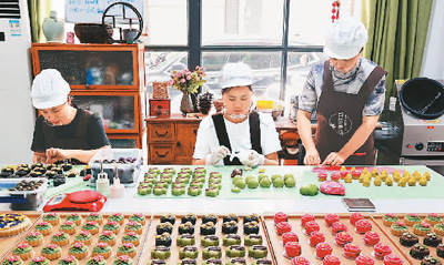 在浙江省金華市,非物質(zhì)文化遺產(chǎn)“清明馃”代表性傳承人汪麗娟和工作人員正在趕制純手工“國(guó)潮”月餅的中秋訂單。