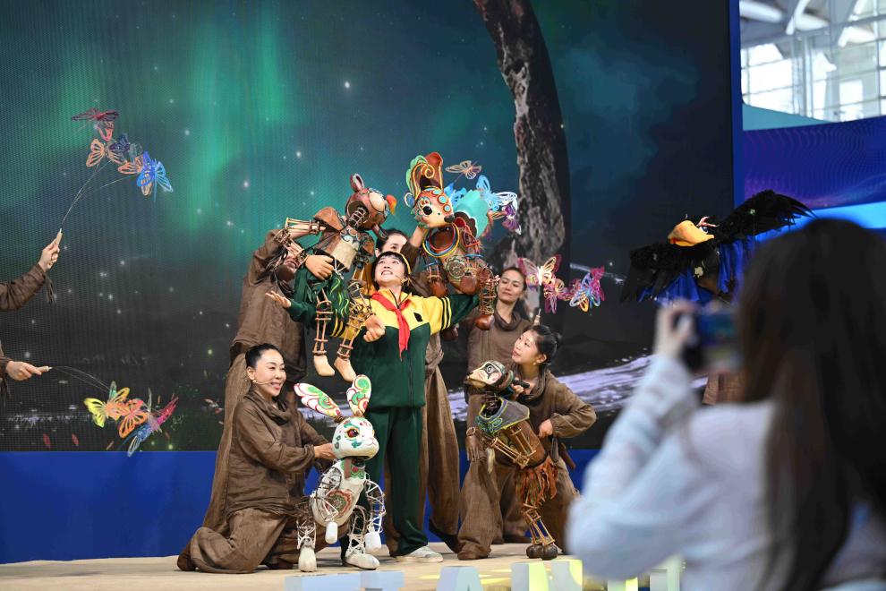 2024中國(guó)文化旅游產(chǎn)業(yè)博覽會(huì)上,中國(guó)首部XR數(shù)字音樂(lè)兒童劇《敦煌·九色鹿王》在博覽會(huì)天津河西展區(qū)表演。新華社記者 孫凡越 攝