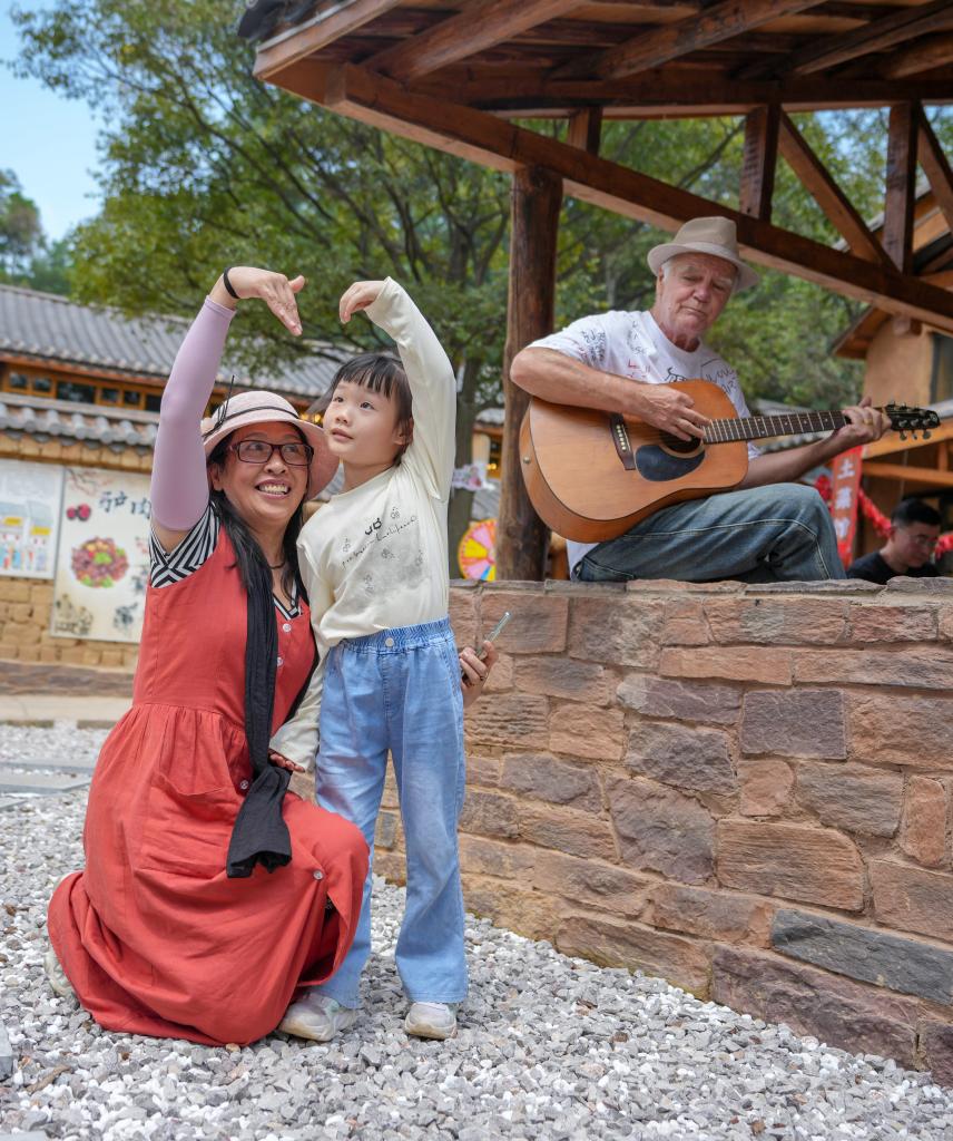 王伶(左)和一名小朋友在土瓜沖村合影,她的愛(ài)人在一旁彈吉他(9月15日攝)。新華社記者陳欣波 攝